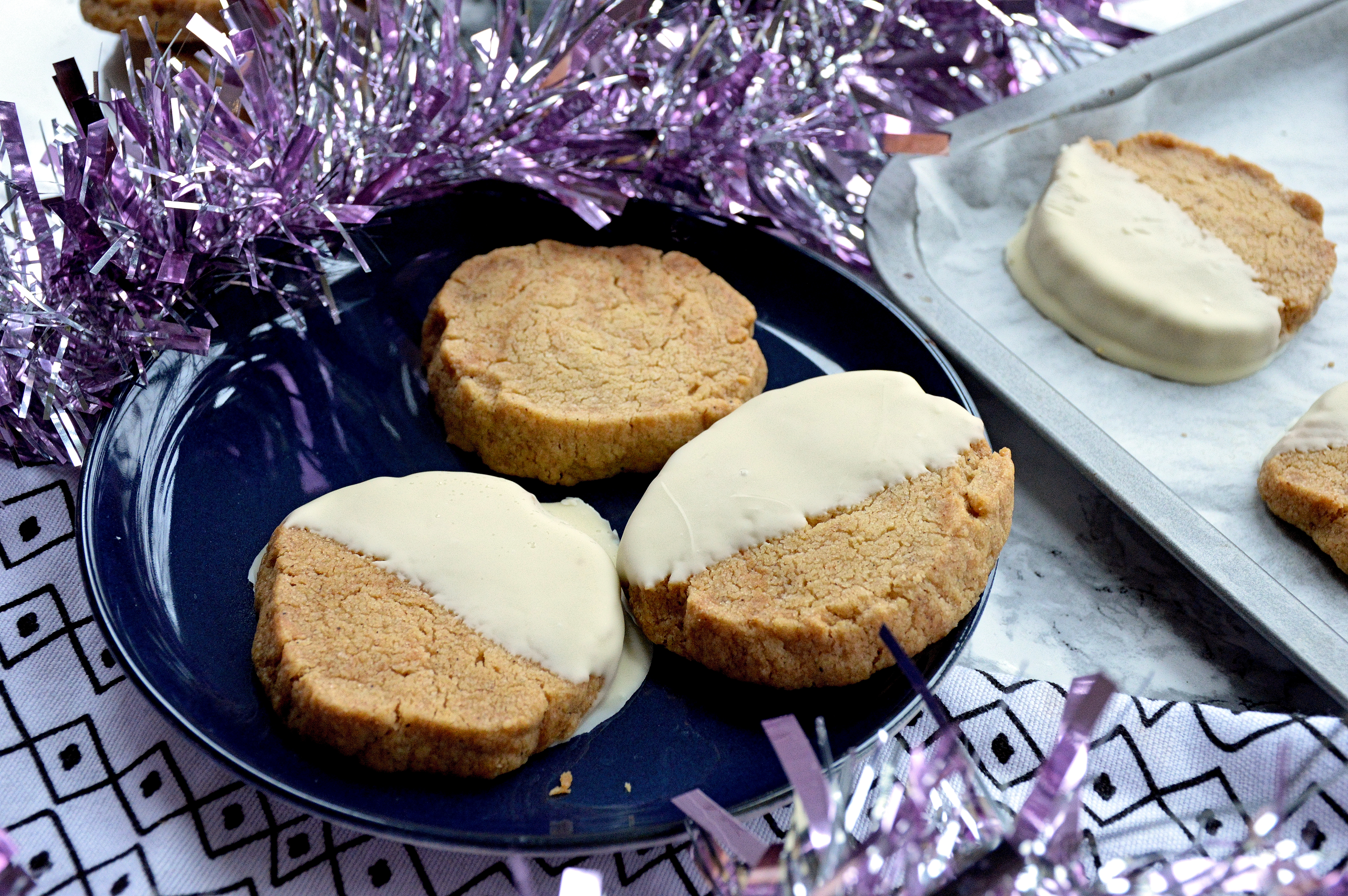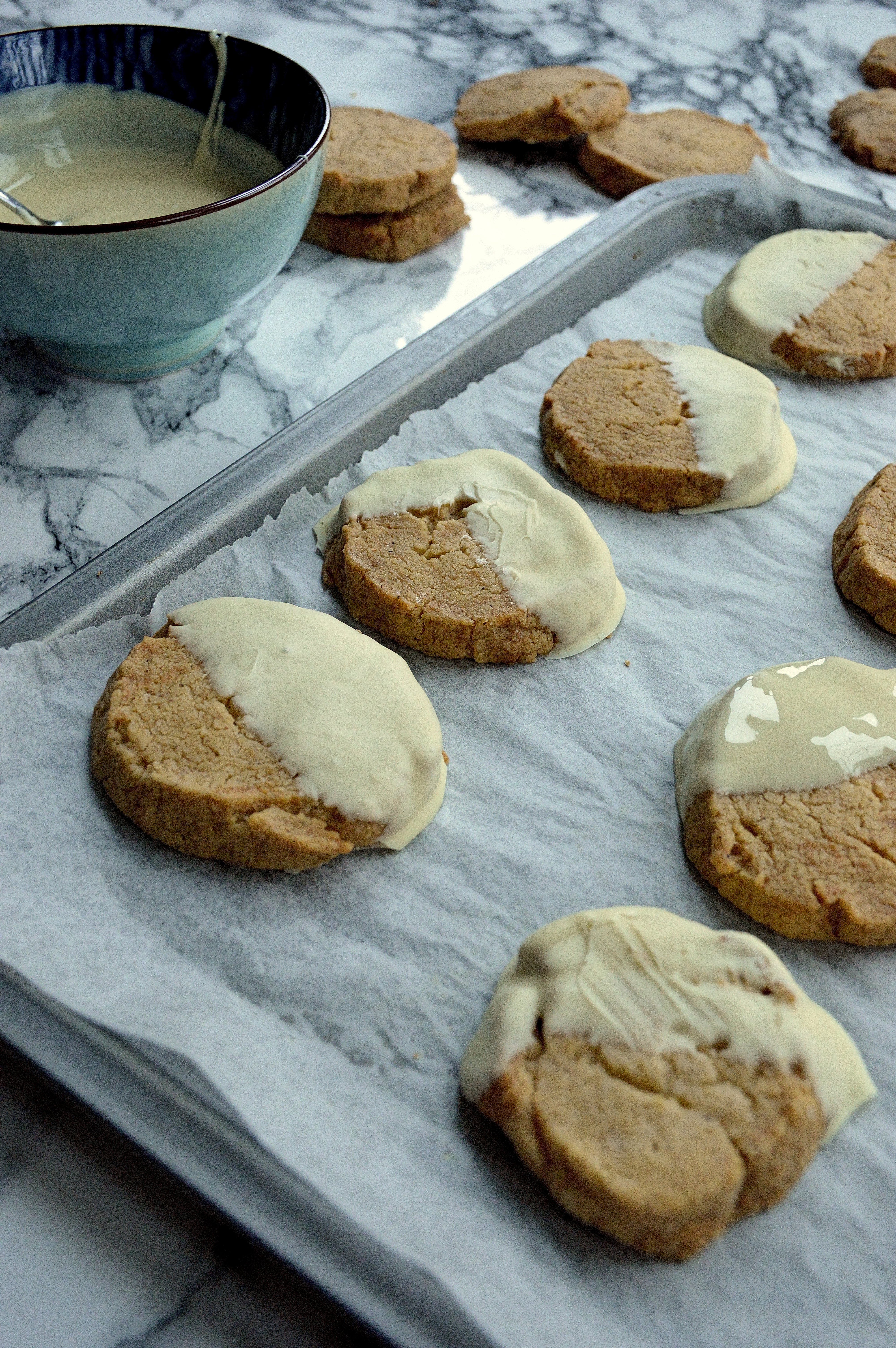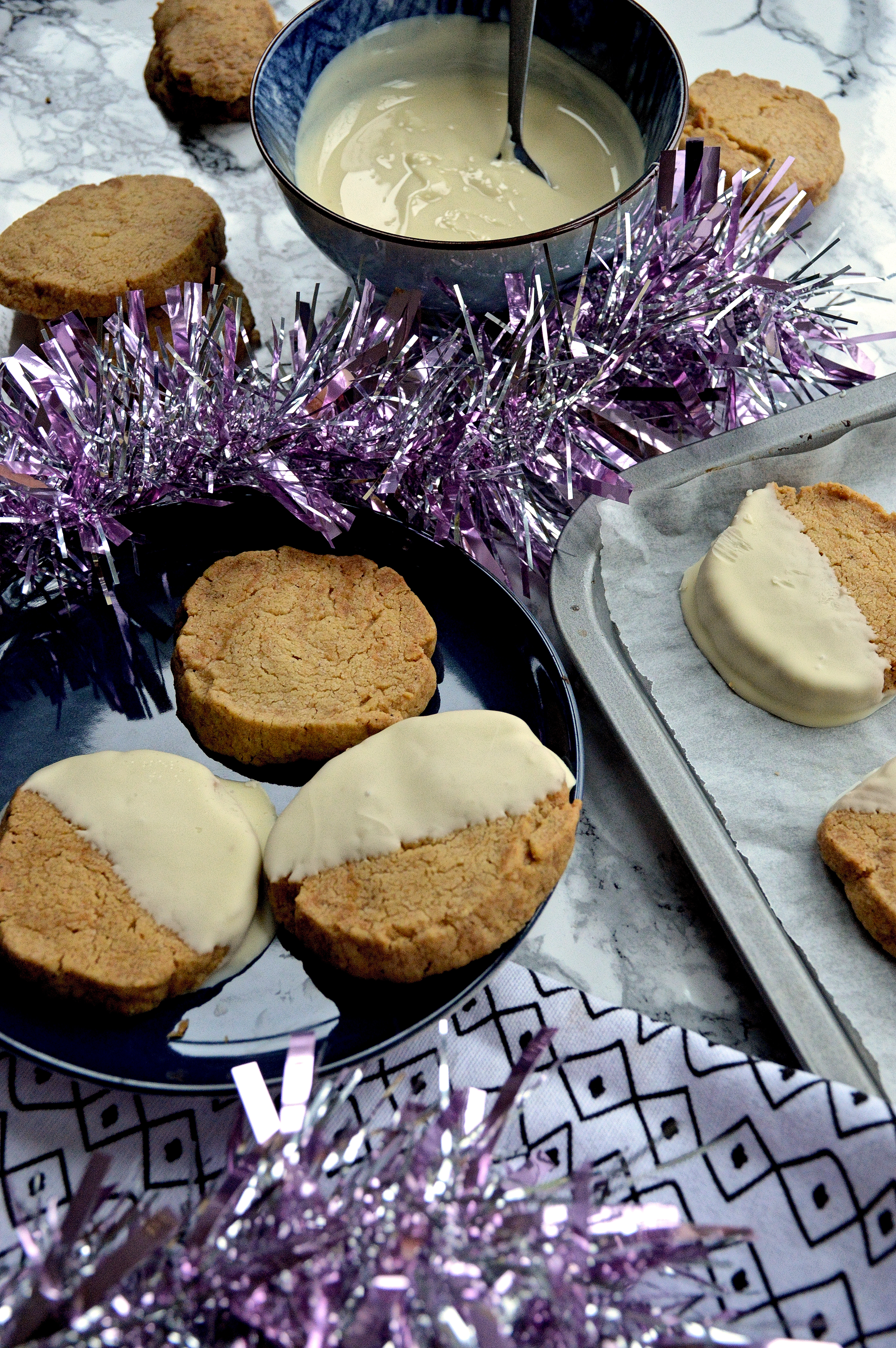 7. At this point, melt some white chocolate and then dip the biscuits into the chocolate, allowing them to set before eating.