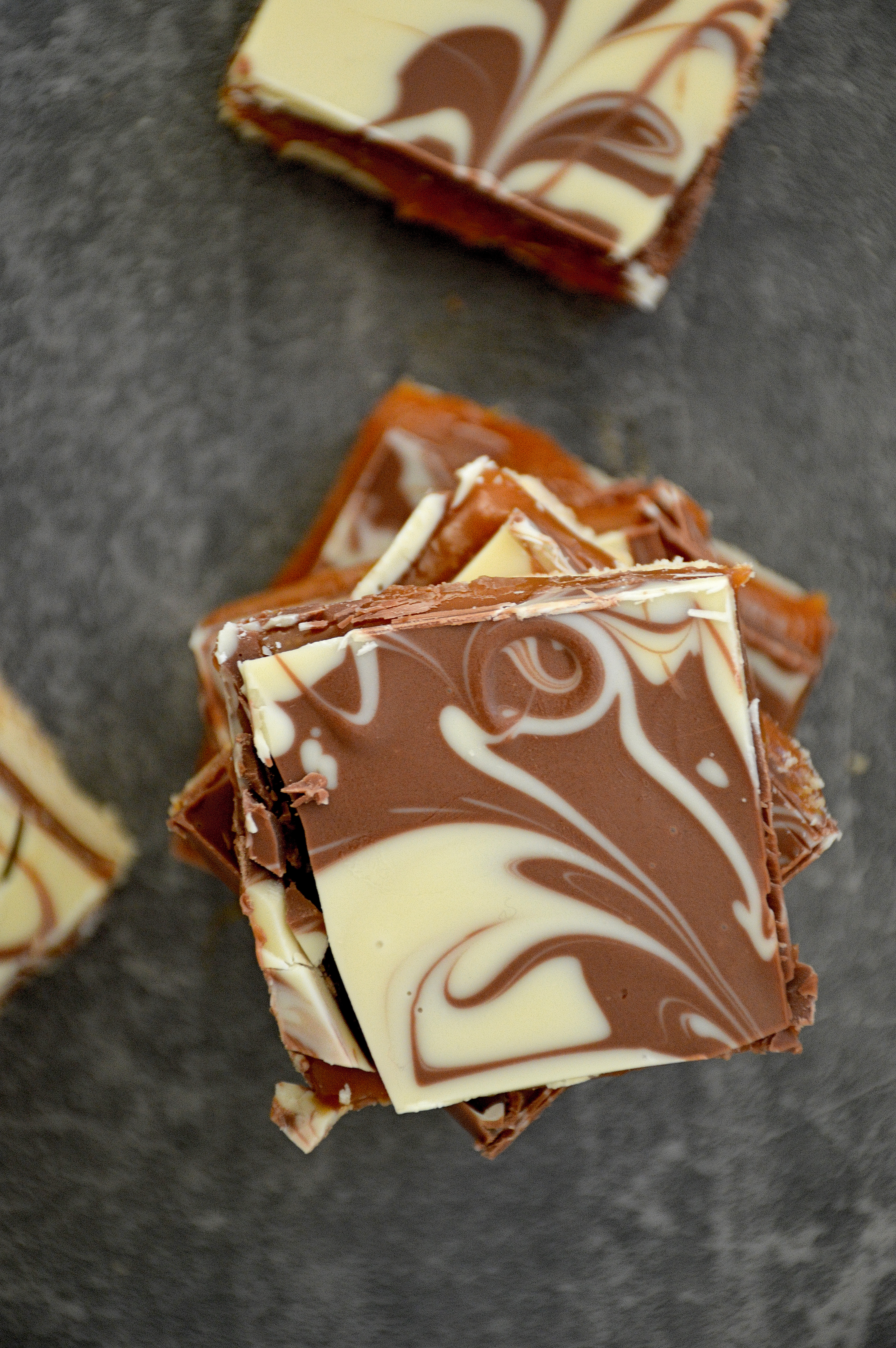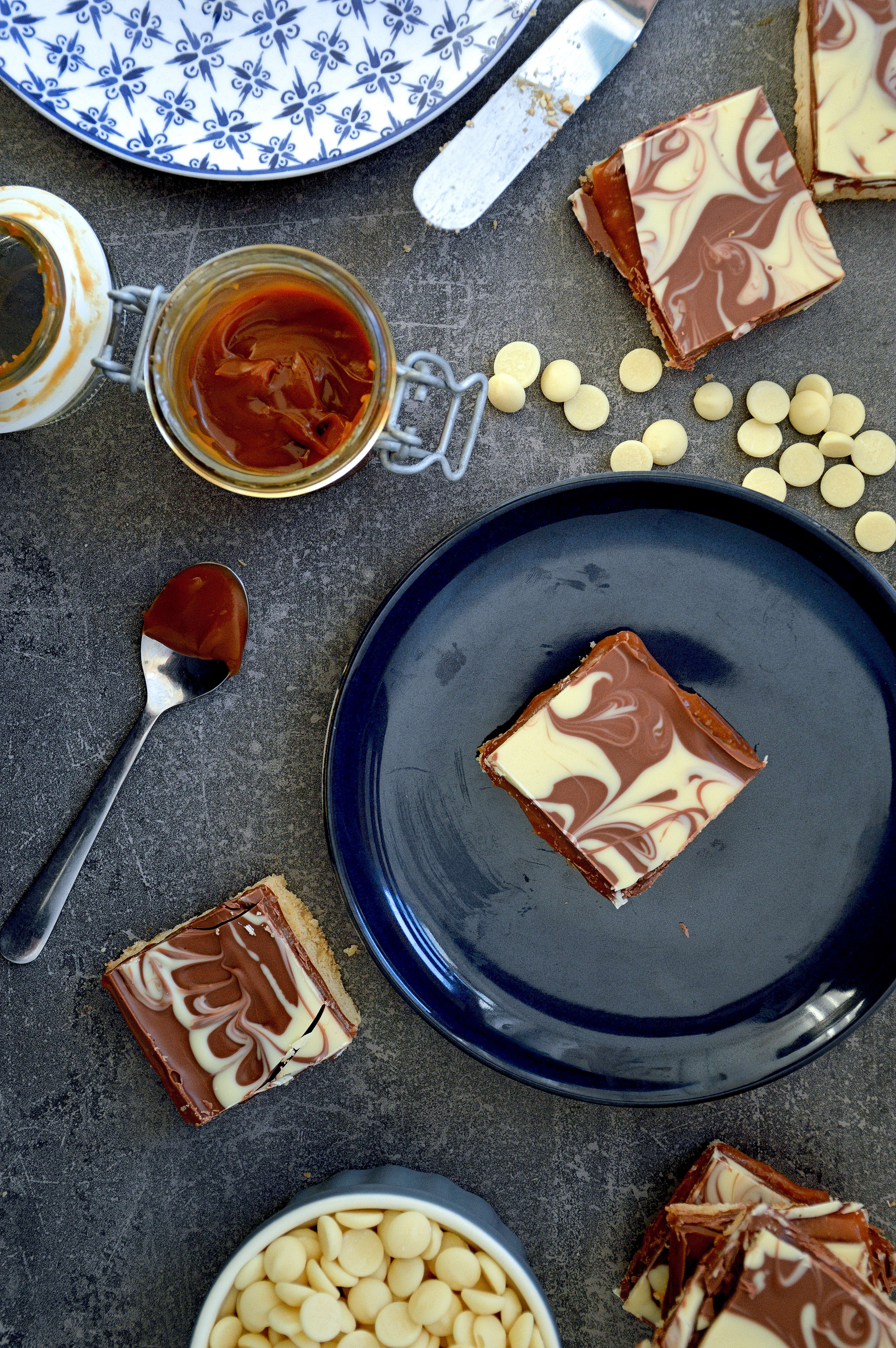 - After 15 minutes, remove the shortbread from the freezer and top with the melted milk chocolate, ensuring that the chocolate completely covers the top of the caramel. Spoon the white chocolate onto the milk chocolate and using a skewer or a knife, swirl the white chocolate into the milk chocolate.